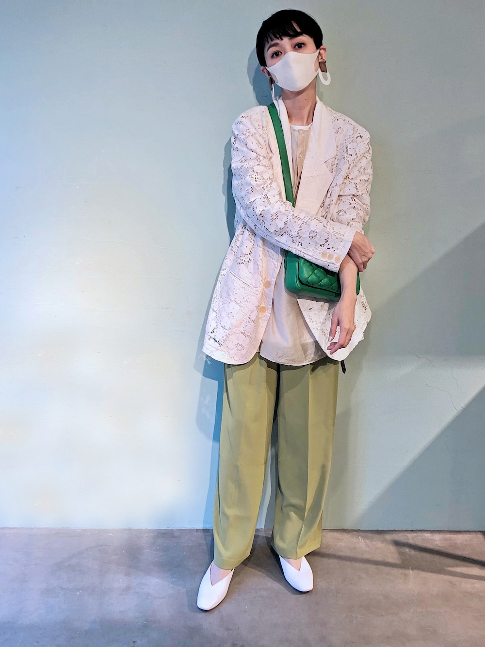 レースのジャケットが綺麗めに 見せてくれるのにカチッとしすぎず 合わせてパンプスもホワイトに グリーンホワイトコーデ