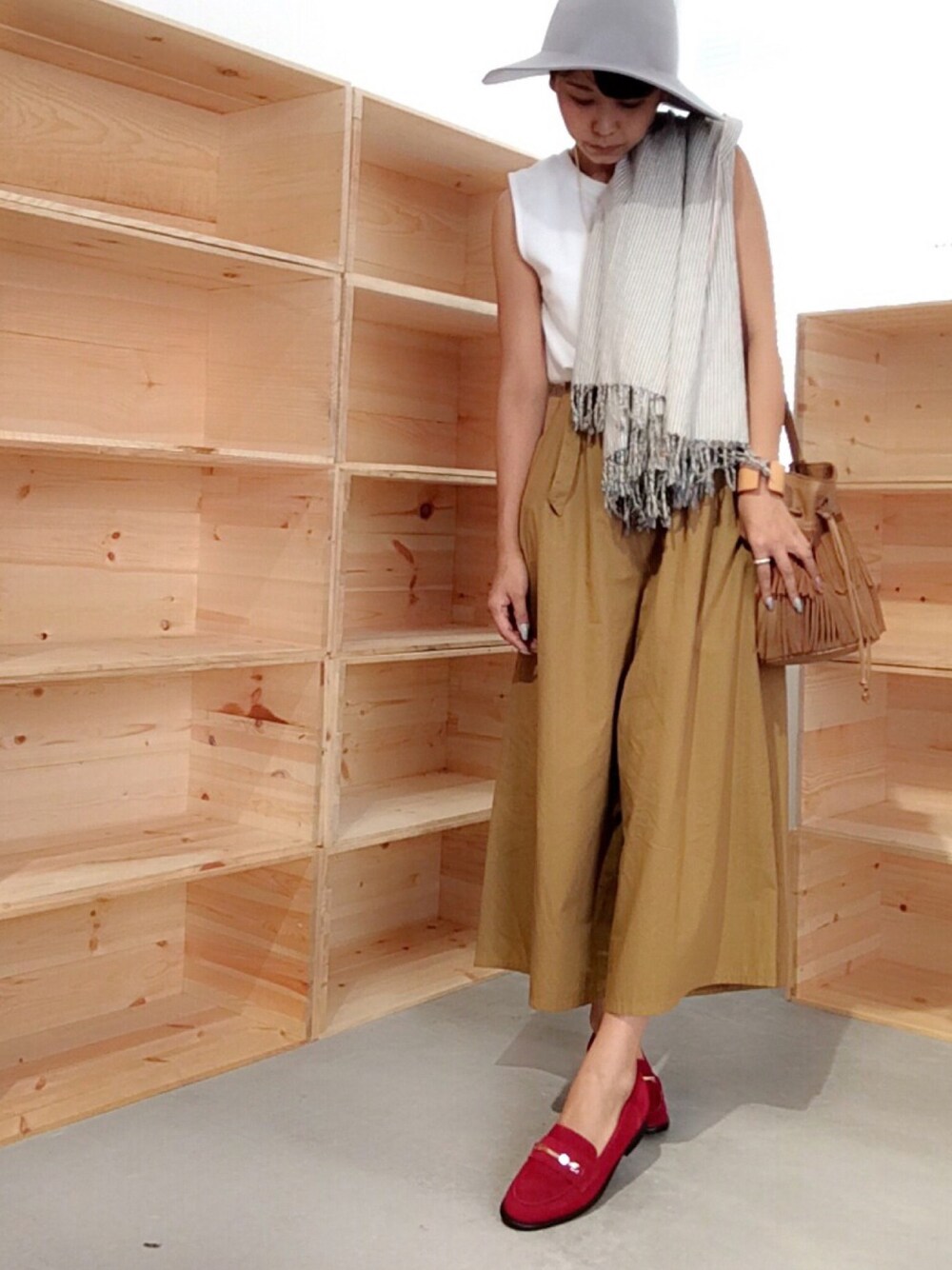 完全に夏に戻ってしまったので、 女は黙ってタンクトップ!! 寒いのは大の苦手なので、友達のブランドのストールは大活躍!! キャメル✖︎レッドコーデをしたくて靴はエンチャンテッドのローファーにしました✨ 毎日ハットをかぶっているんですが、時々蝶々がとまります∑(゚Д゚) 蛾だとは認めない!