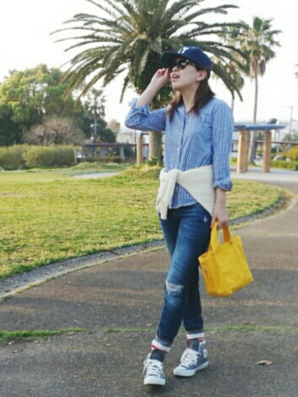 グレー系のスニーカーを着用したレディースの春コーディネートの1枚目の写真