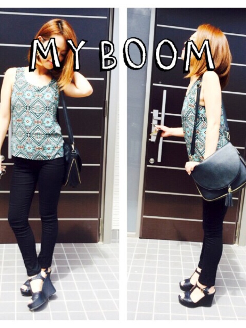黒スキニーに派手柄トップス合わせ♡ カバン、靴も黒で統一しました^ ^