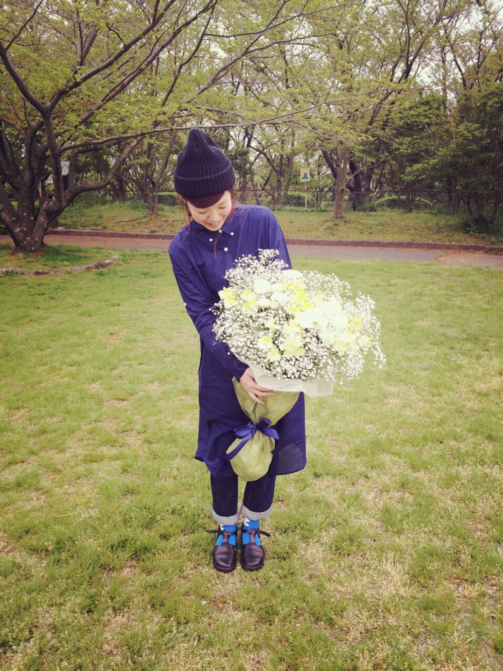 2015.4.19 春なのに〜 全身くら色(´・_・`) 晴れの予定で自転車乗るはずだったのに、朝からどんより曇り空。 花束もらいました♡ こーんなおーーーきーーやつ はじめてです☺︎