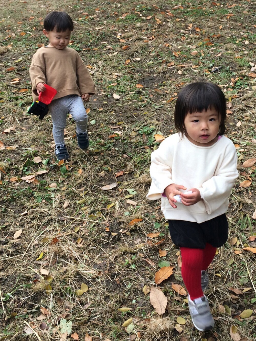 お袖ボワントップス合わせ👫 娘のブルマはコーデュロイ➕赤リブタイツ😍 息子はMINGOのドットレギンス。パツパツ😂