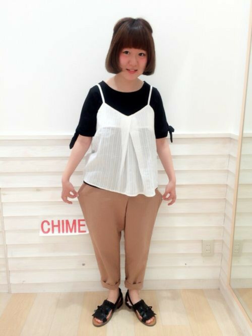 キャミソール×Tシャツのレイヤードコーデ★ Tシャツは袖がリボンになてるのがポイント!