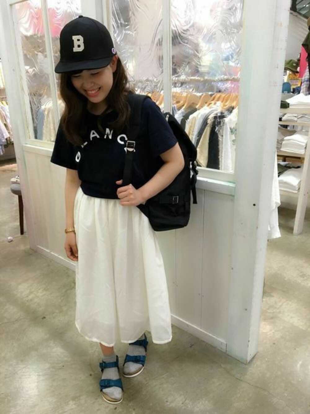 キャップとサンダルでスポーティコーデ。 白のガウチョで甘さを+。