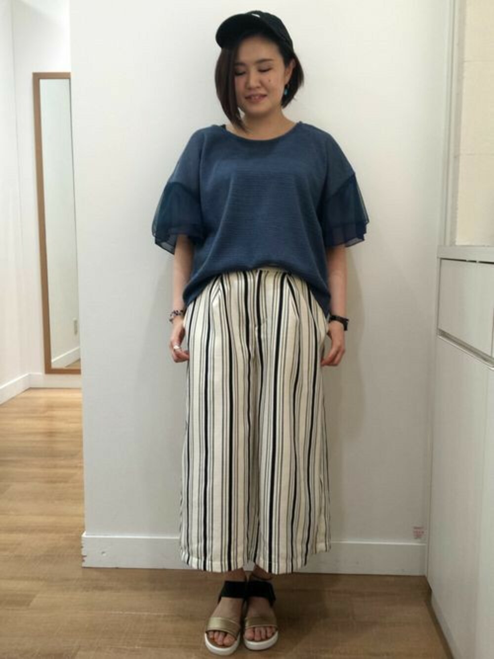 シフォンとチュールを重ねたフリル袖にキャップとスポサンをあわせた甘辛MIXコーデ。