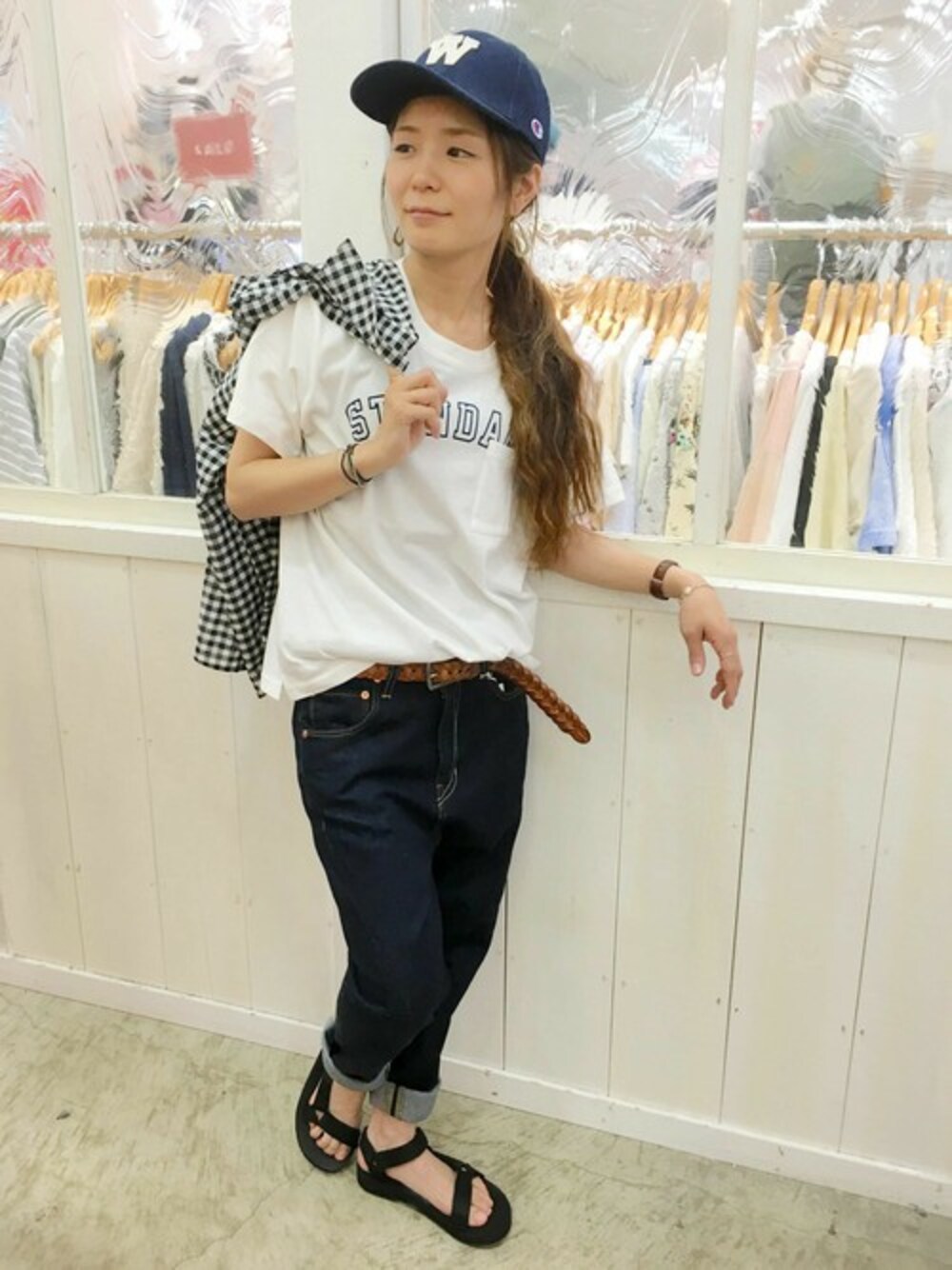 子供っぽくなりがちなプリントTシャツ… シンプルなボトムで大人カジュアルに◎  さらにキャップや、サンダルの小物をプラスして、スポーツMIXスタイルに◎