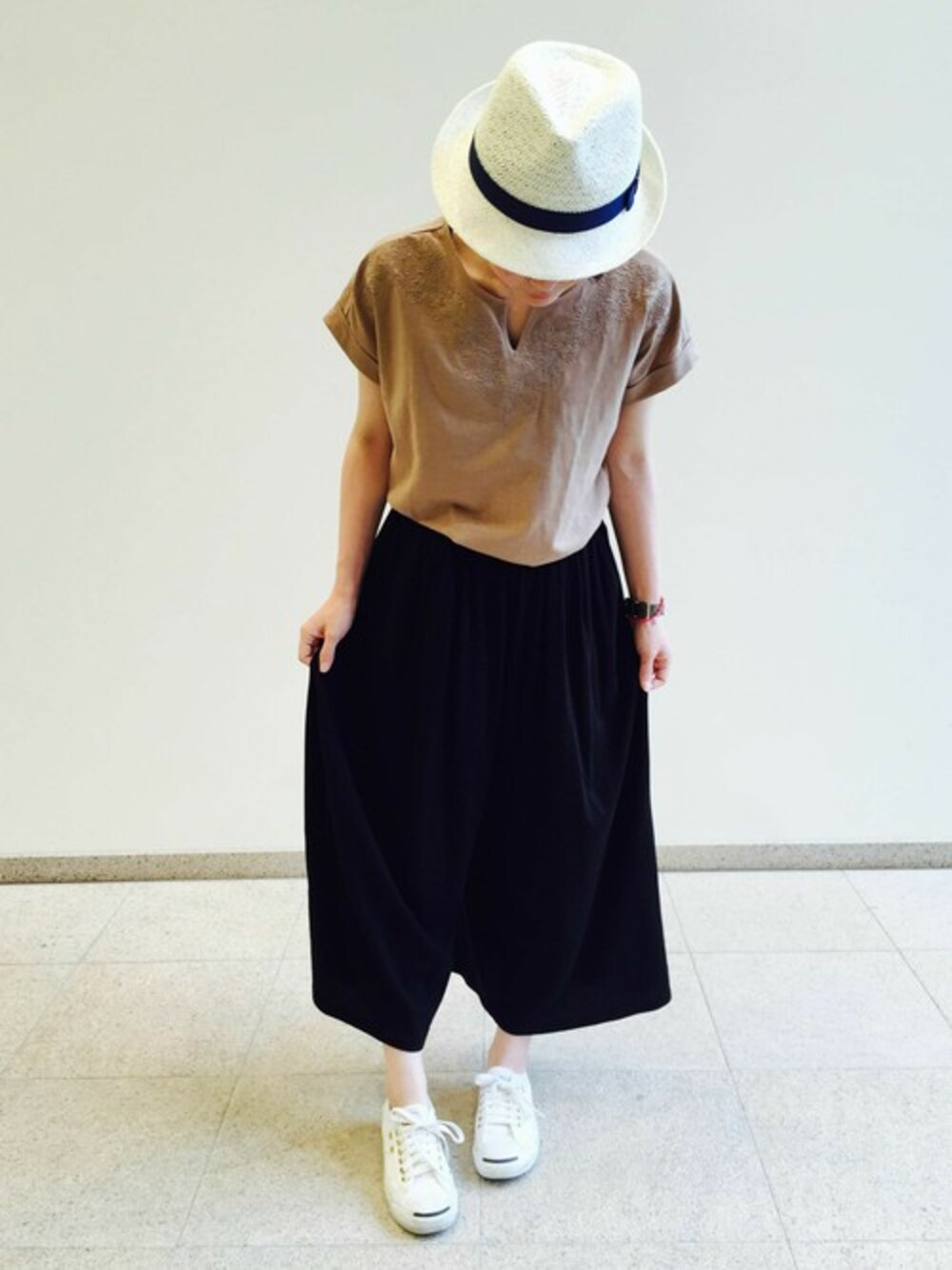 シックに黒のガウチョ×刺繍トップスのコーデ。 スニーカーではずしてこなれた印象に♪