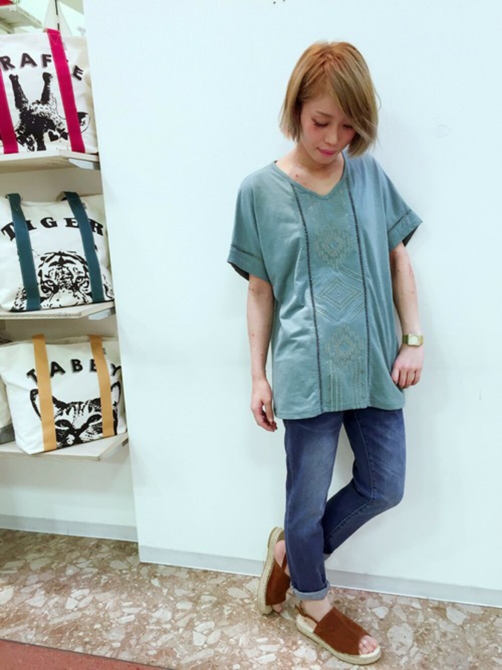 グリーンのチュニックは、首元がVネックでデコルテが綺麗に見える¨̮♡︎ 前面の刺繍がポイント‼︎ボトムは、デニムでシンプルに(*´꒳`* )フリンジサボサンダルでエスニックコーデにしてみました¨̮♡︎