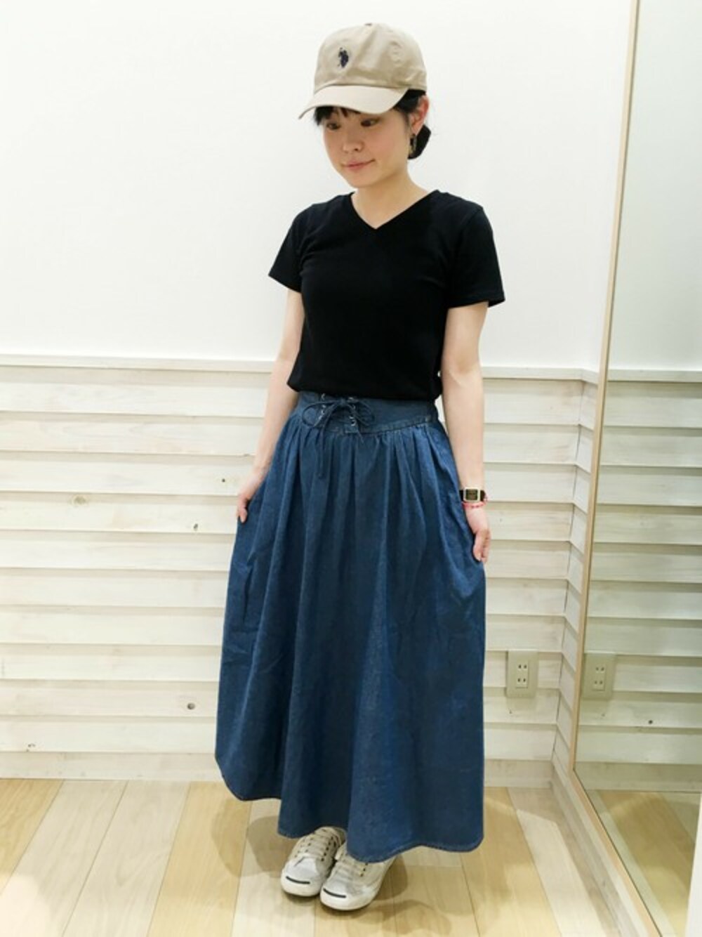 シンプルコーデ。Vネックでスッキリとした印象に