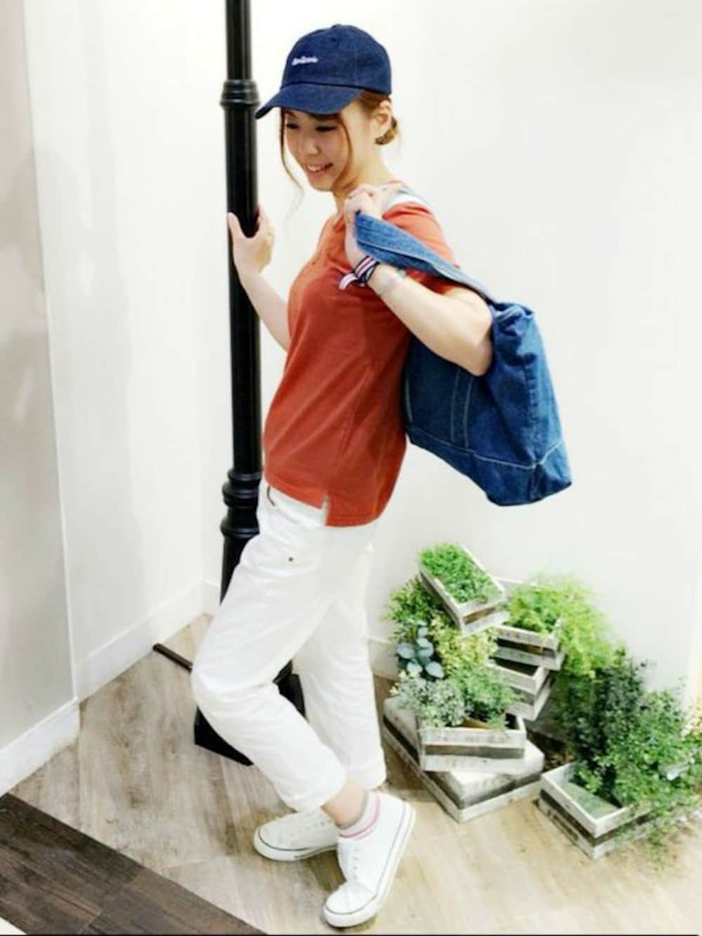 トップスはちょい派手目に!! ボトムスとスニーカーは白で統一感を!! シンプルになり過ぎないようキャップとバッグはデニム素材を!!