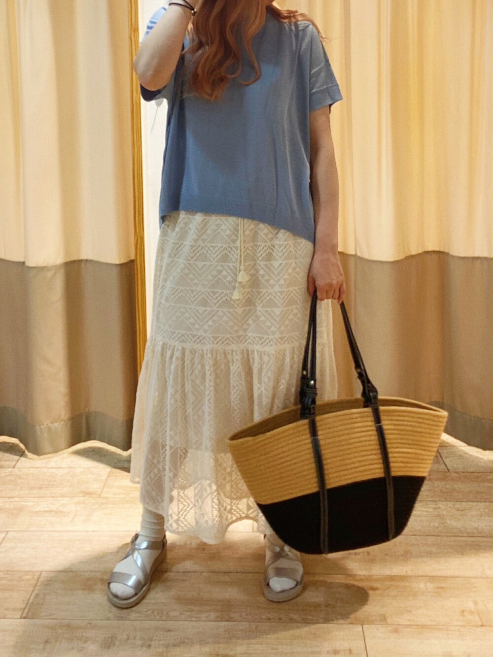 トップスの淡いサックスブルーがさわやかな夏コーデです。
