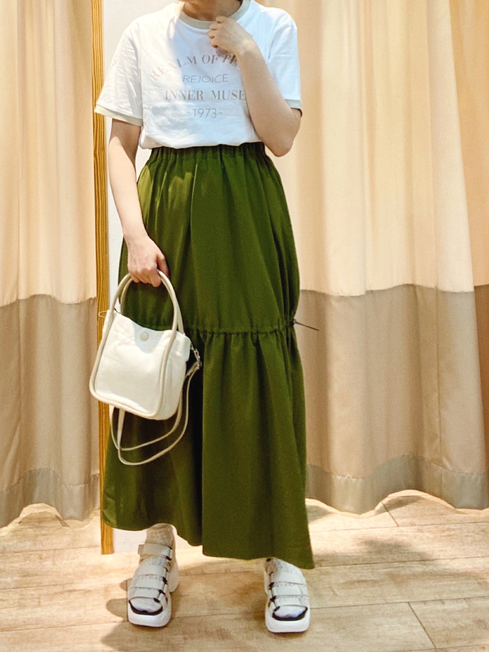 ドロストボリュームスカートはギャザーのゴム部分を絞って履くとまあるいシルエットになりかわいいです。 絞ってもお尻周りなどは膨らみ過ぎないのもポイントです!