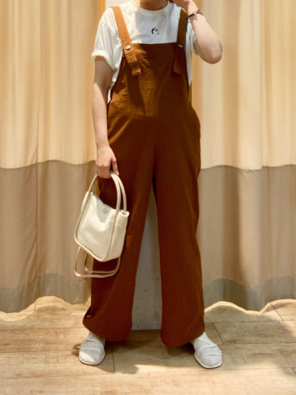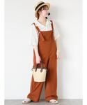 ワンコ刺繍のTシャツとサロペットを合わせたカジュアルなコーデを組んでみました。 キャメルのサロペットはインナー次第で秋ぐらいまで長く着れちゃいます。