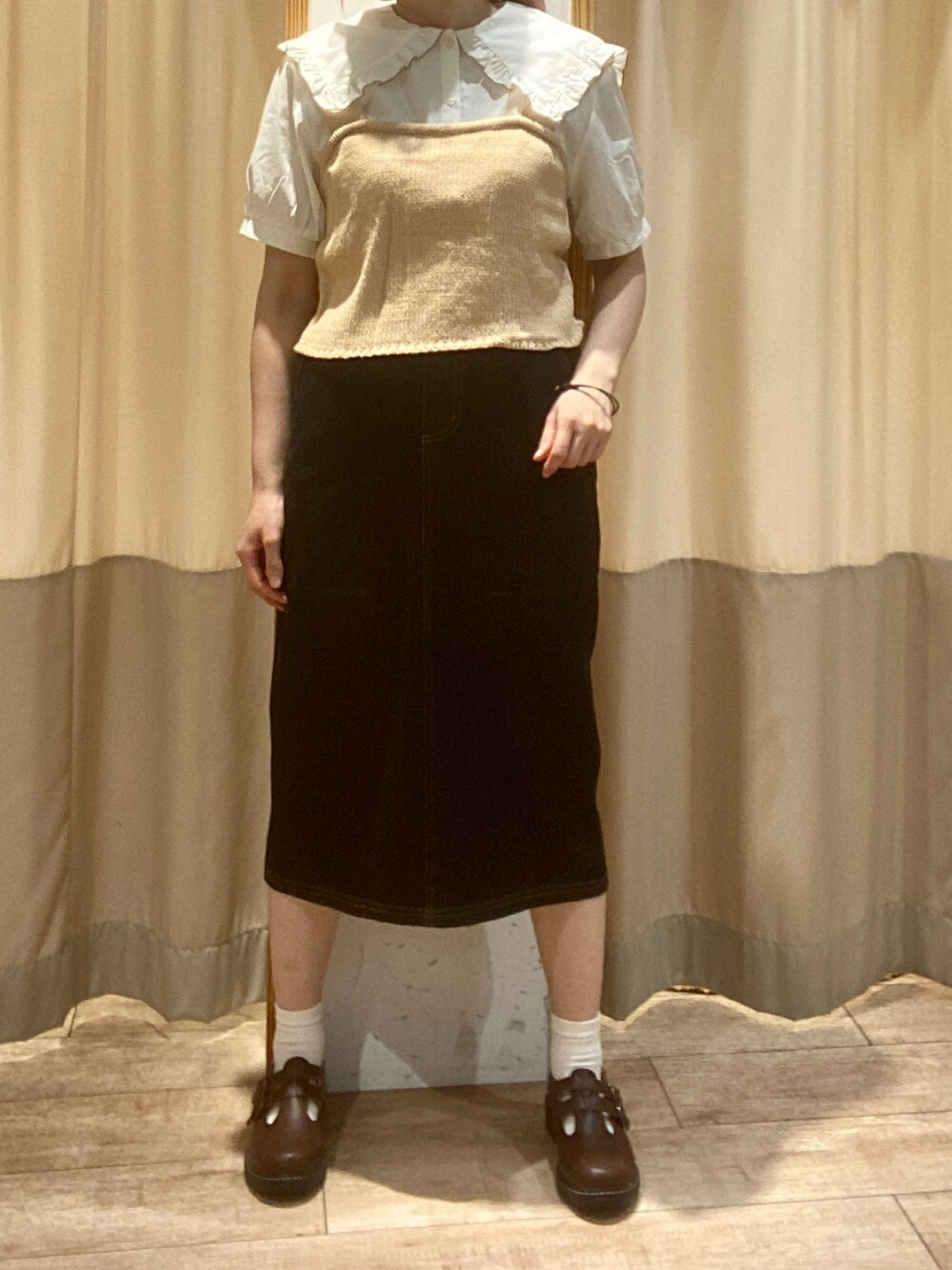 秋先取りのニットビスチェをブラウスに合わせてガーリーなコーデにしてみました。