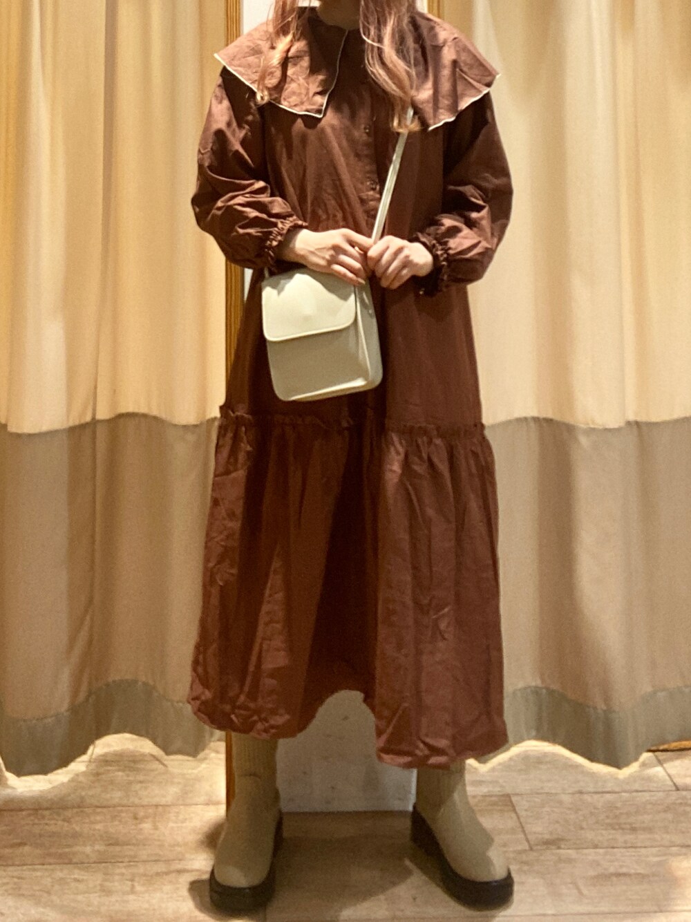 秋らしいブラウンのワンピが主役のコーデです。 一時期枚でサマになるのでコーデに悩まず着ていただけます。