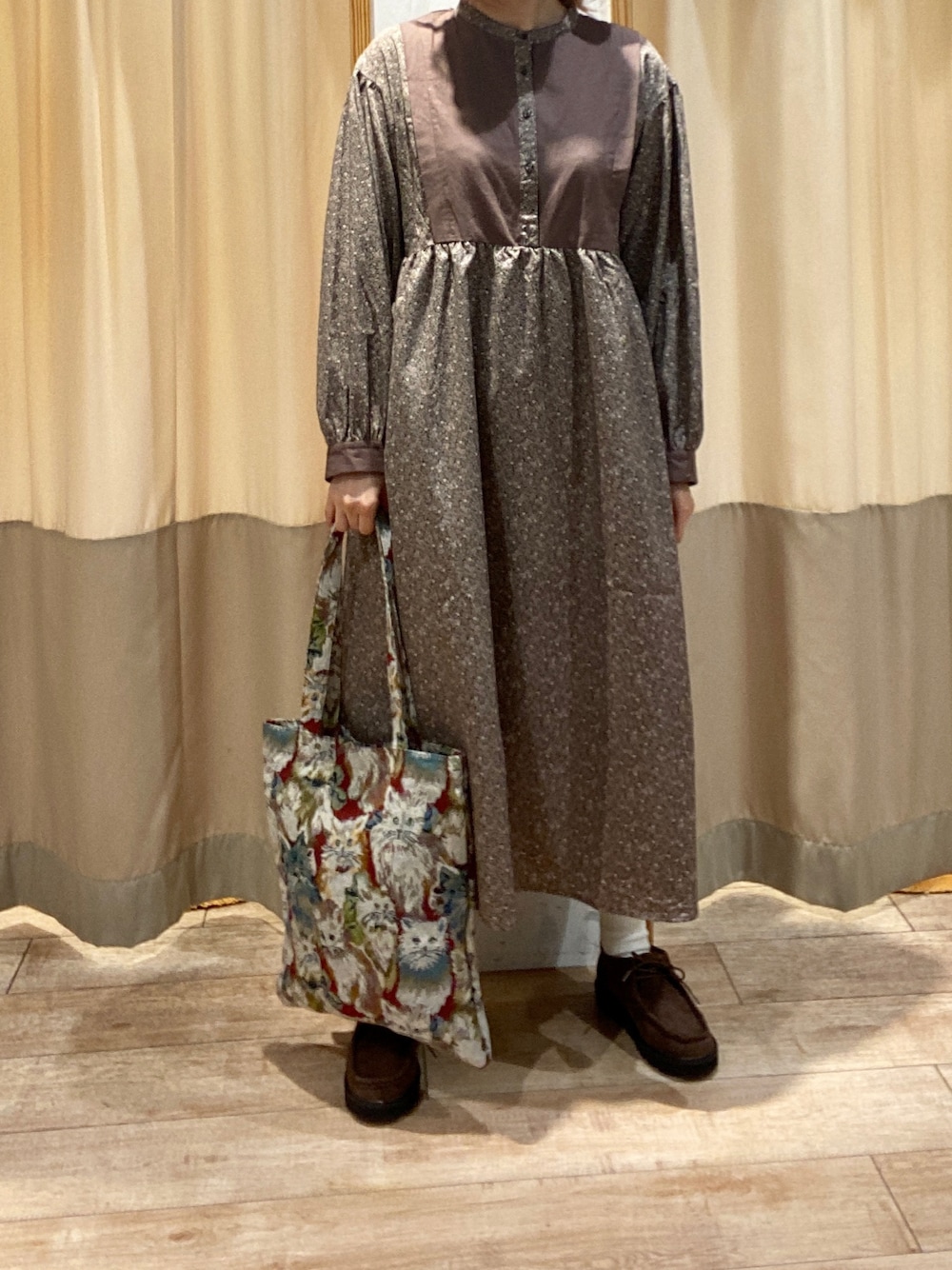 りのワンピース「花柄切替ワンピース」を使ったコーディネート
