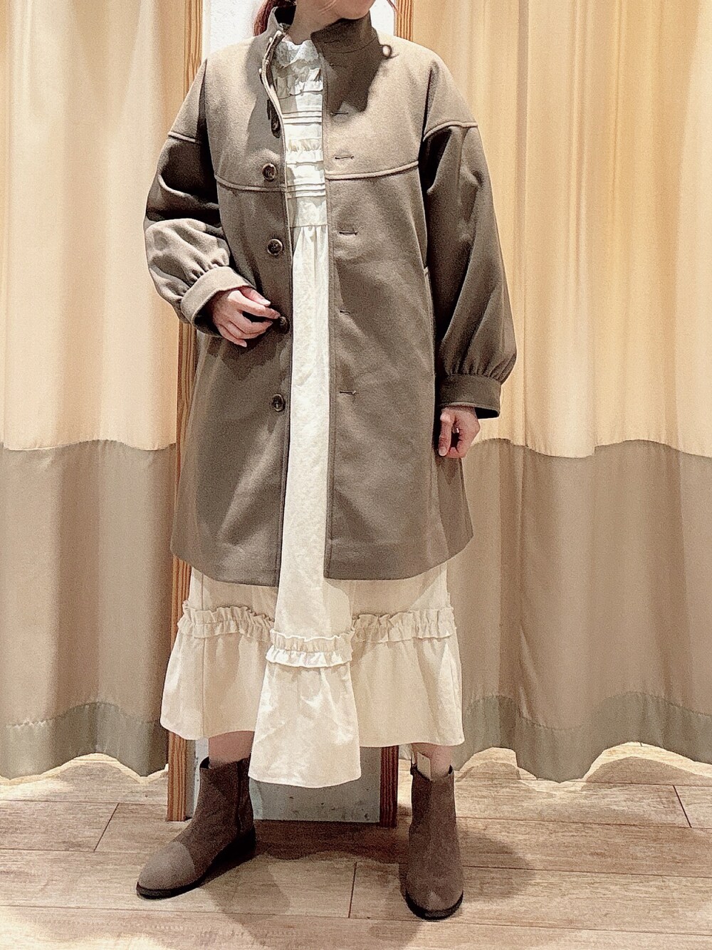 コートはお袖のぽわんとしたパフスリーブがかわいいです。 とても軽く、ロングコートですが長過ぎないので身長問わず着ていただけます。