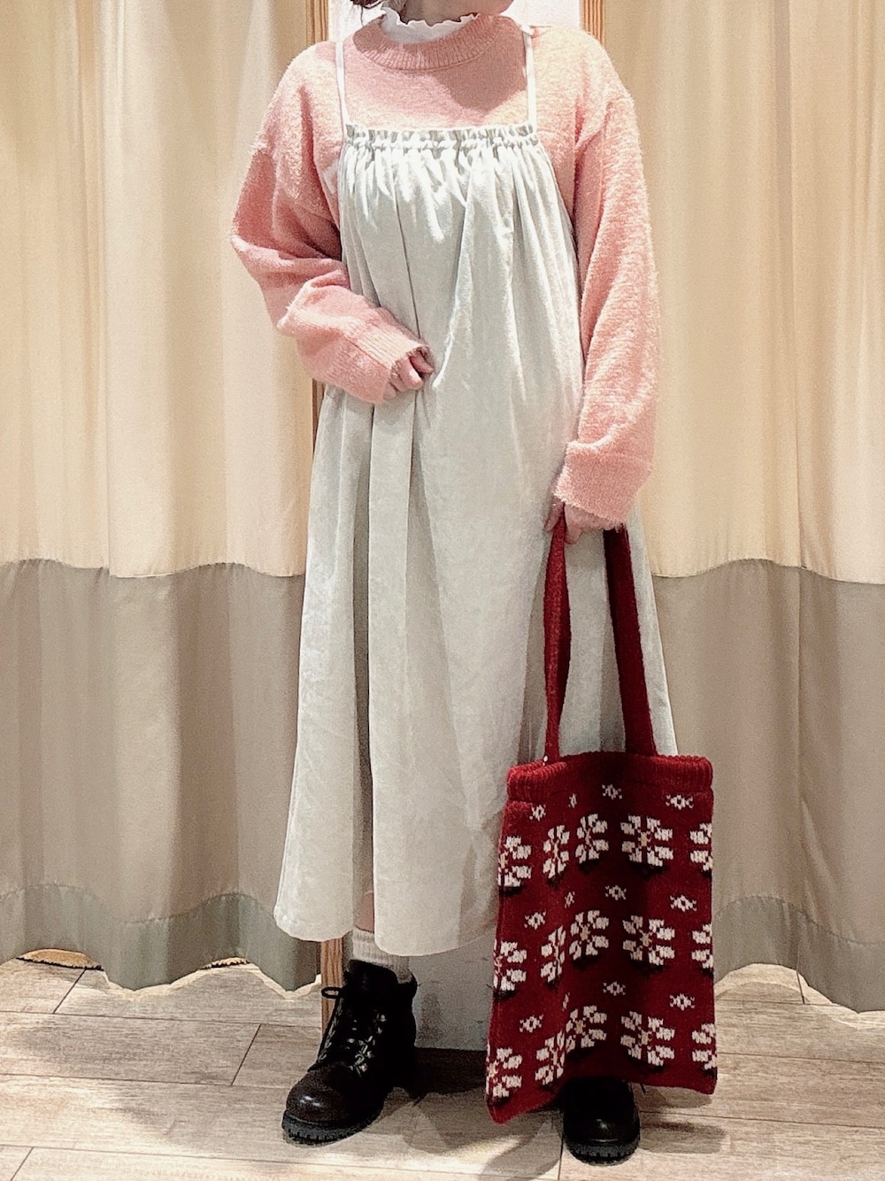 コーデュロイのキャミワンピースは胸元にたっぷり入ったギャザーがかわいいです。 ゆったりとしたつくりなので厚みのあるニットと重ねて着ていただく事もできます。