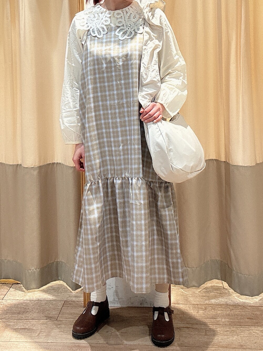 キャミワンピは暖かくなっても使える生地感です。 今回はレース襟のブラウスを合わせてガーリーなコーデにしてみました。 カットソーなどのカジュアルなアイテムと合わせるのもおすすめです。