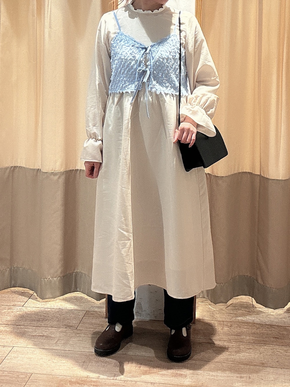 キャミ付きのワンピースはデニムと合わせるのも可愛くておすすめです。