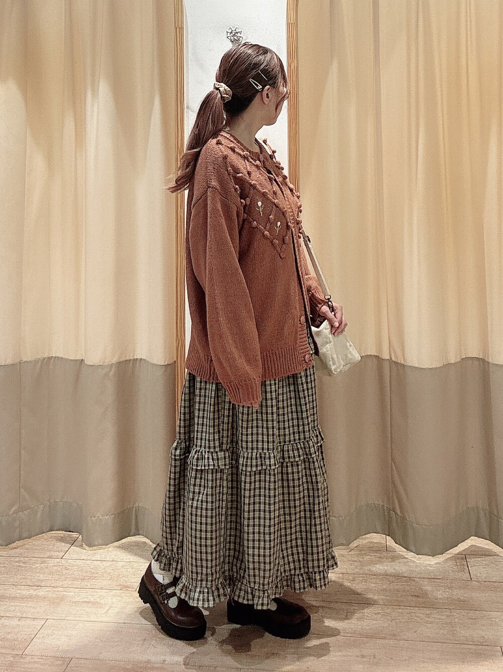 カーディガンはぽんぽんがたくさん付いてかわいいです。 長め丈なので甘過ぎない印象になっています。