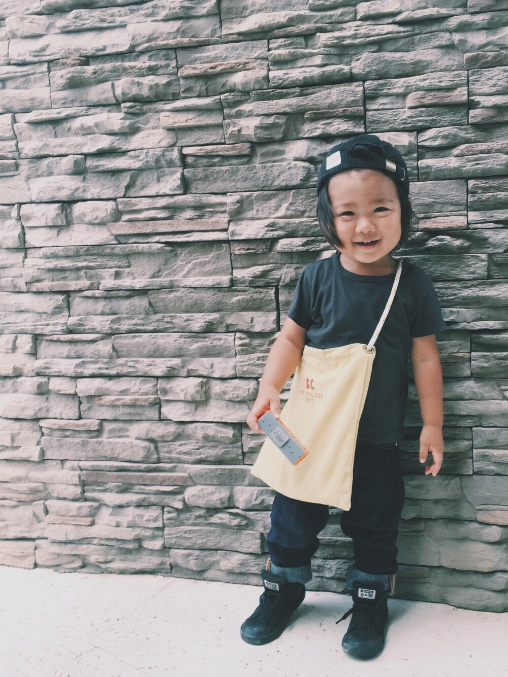 ☺︎☺︎☺︎ シンプルコーデにイエローの差し色。 バッグの黄色地に赤の文字が◎