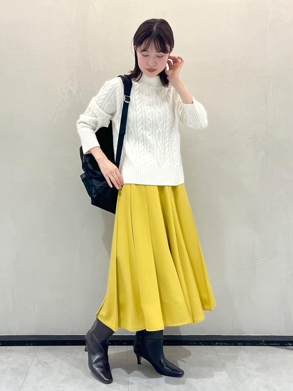 ケーブルニット×フレアスカートに PacSacを合わせてカジュアルダウンさせました♪ ニットはコンパクトなサイズなので、小柄な方にもお勧め◎ スカートのフレアシルエットが女性らしさをプラスしてくれます!