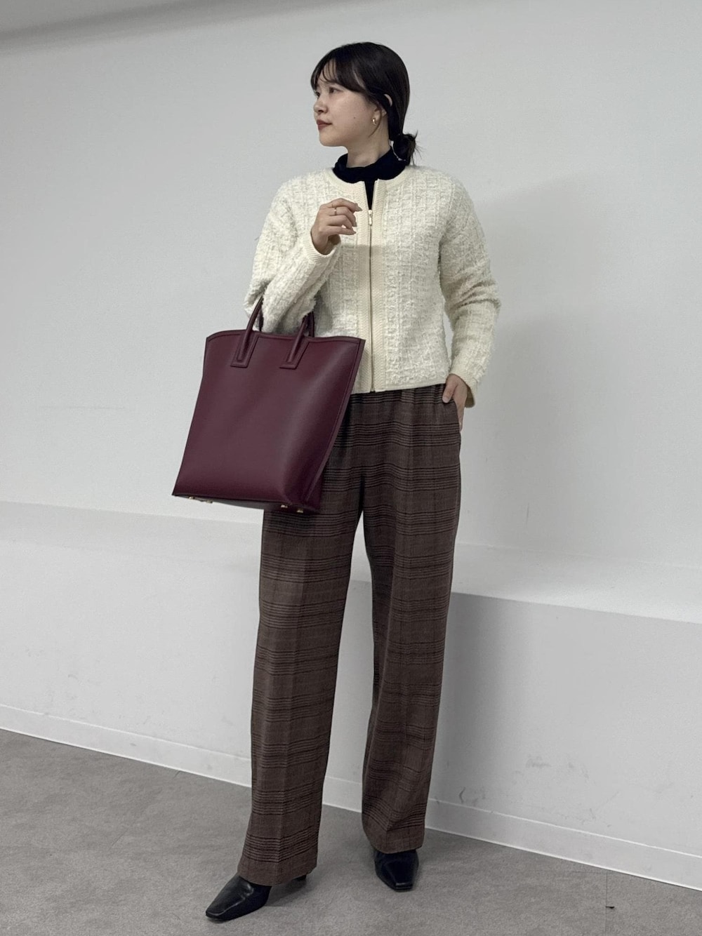 カーディガンは、スパンコールが入った 華やかさのあるツイード調素材。 カーディガンとブルゾンの間の感覚で着られます♪ チェック柄のパンツとボルドーのバッグを合わせて 秋冬らしさをプラスしました♪
