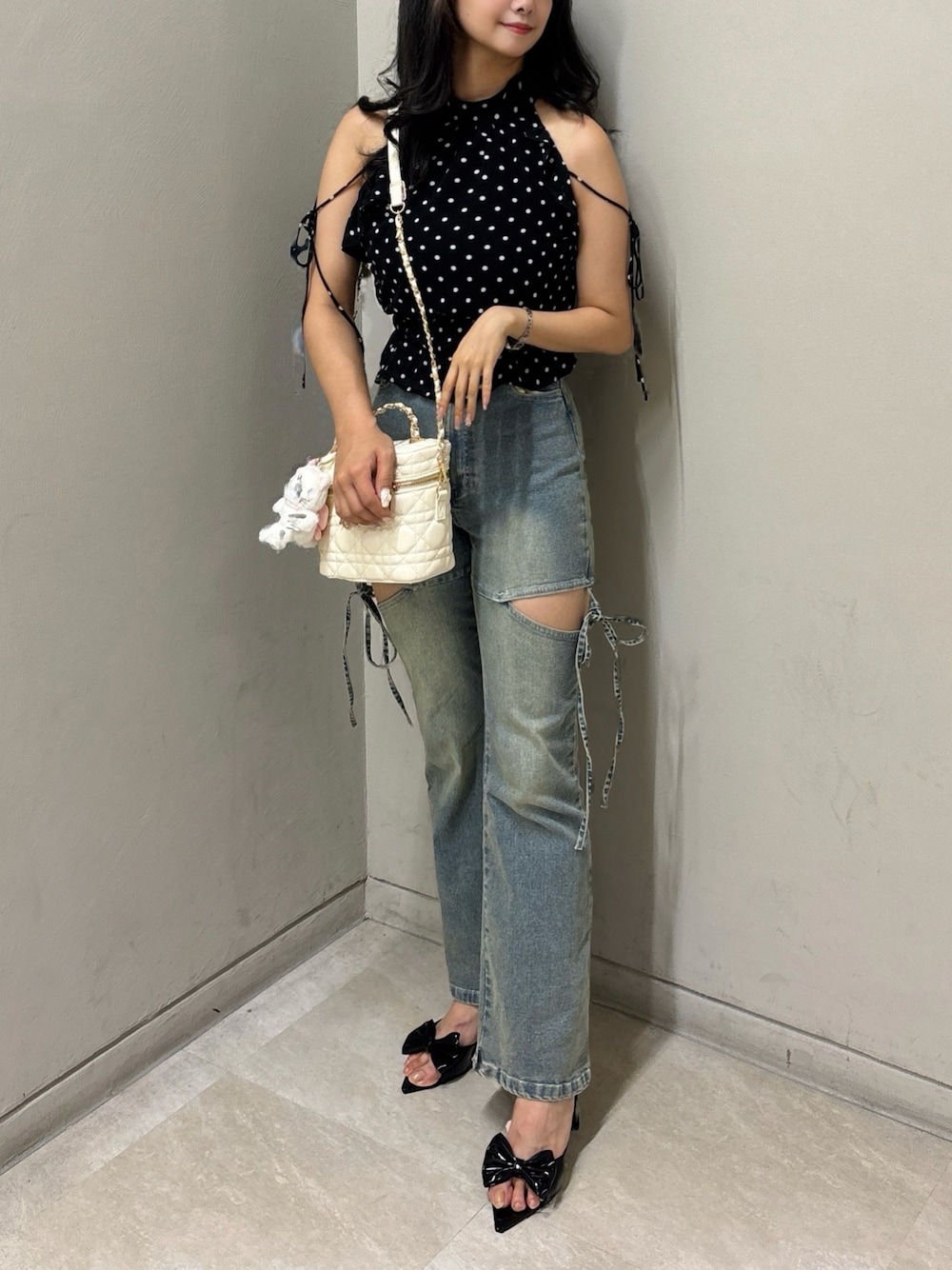 Rio【 骨スト / ブルベ夏 】(one after another NICE CLAUP)のデニムパンツ「サイドオープンリボンフレアデニムパンツ」を使ったコーディネート