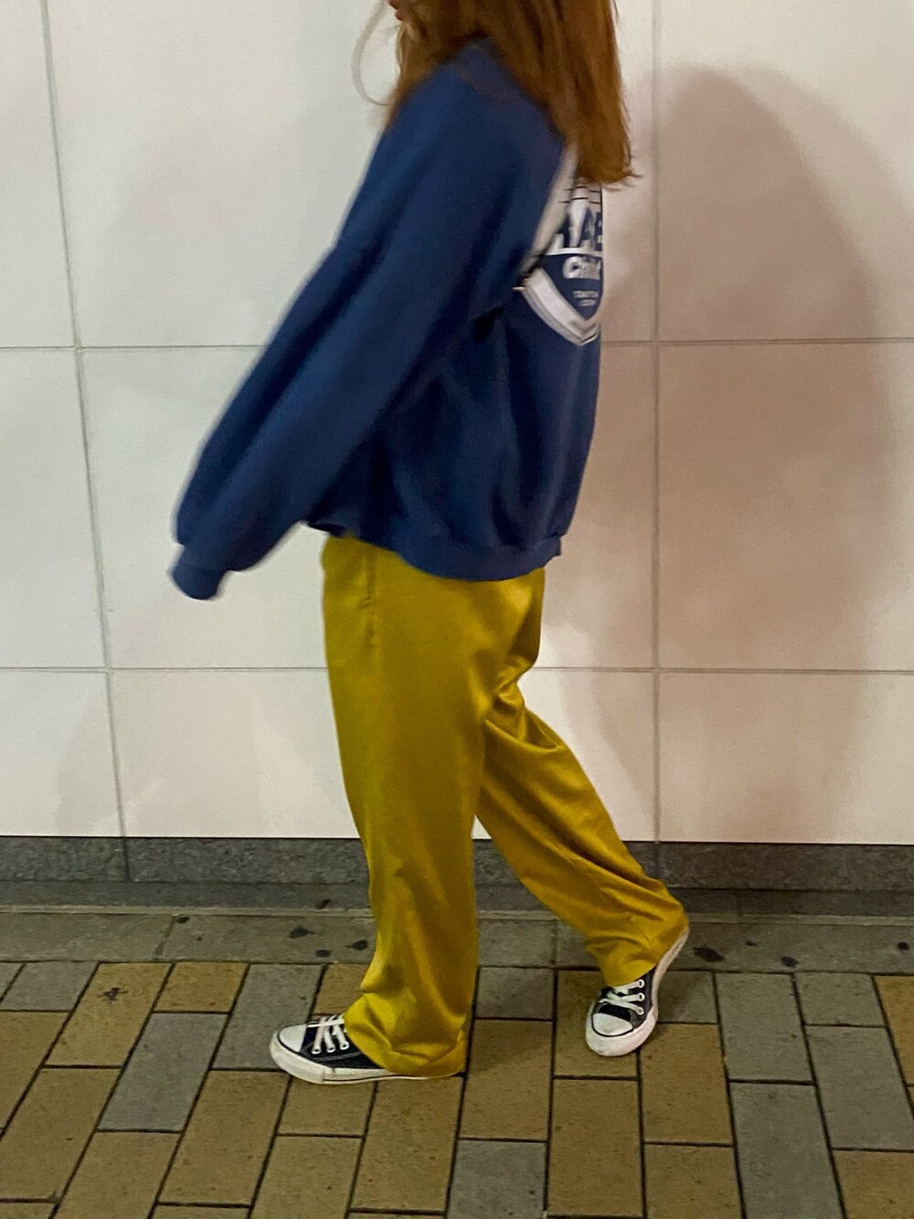 ゆるゆるすぎる格好〜 ブルーのぶかぶかトレーナーに イエローズボン🍋 トレーナーの後ろが可愛いロゴ入ってて 後ろも前も可愛い♡ ここのトレーナーシンプルで それでも可愛いから好き!