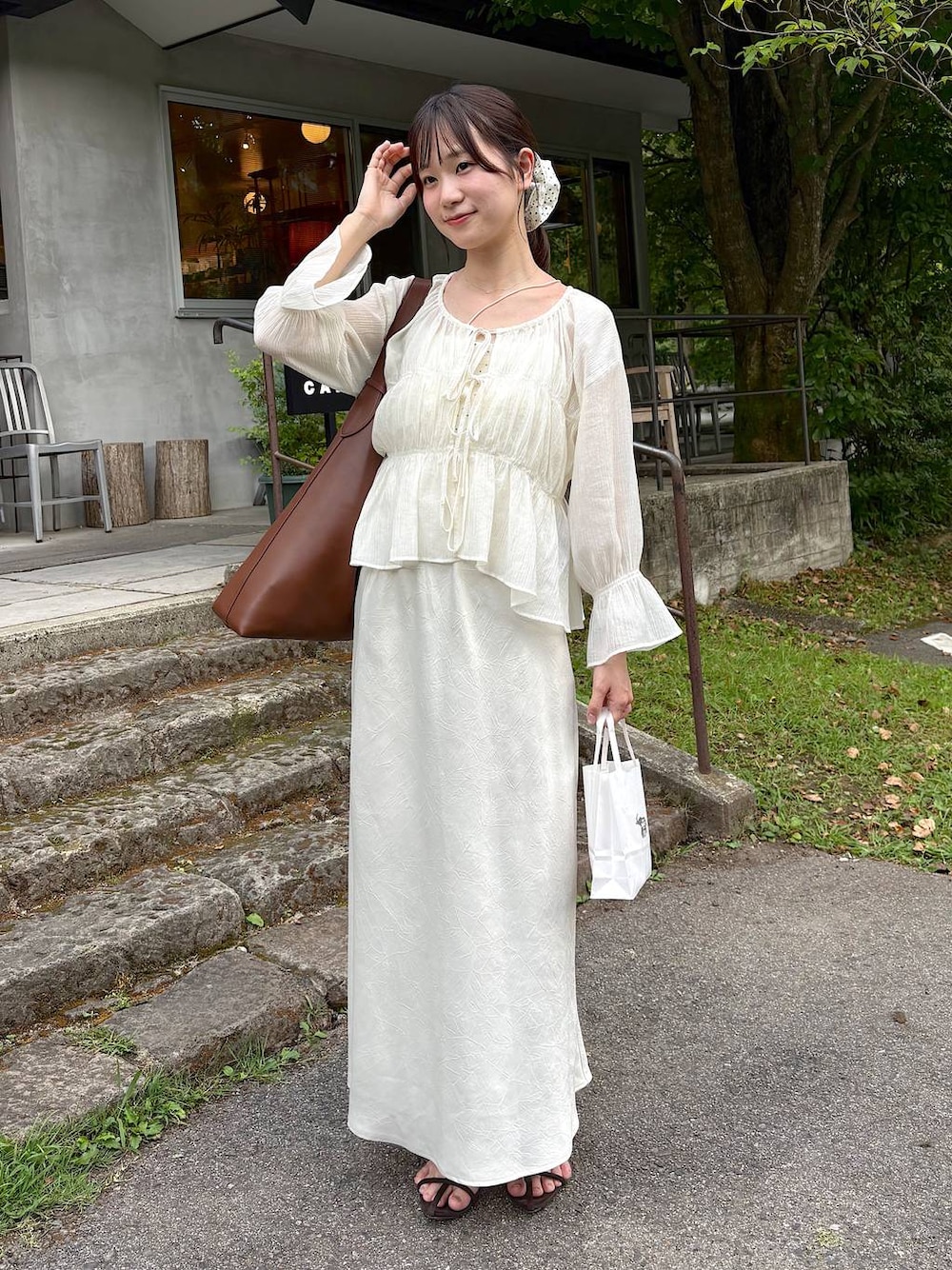 🏷️お出かけコーデ ブラウスは春から人気のブラウスの6分丈ver.です!ナイロンにレーヨンを交織しさらりとしたヨウリュウ調の生地を使用しています! 凹凸のある表面感とさらっとした風合いが特徴の素材で暑くなる時期にもさらっと着用いただけます! スカートは適度な厚みとツヤのあるサテンにシワ加工をすることで、程良い落ち感があるスカートです! セミフレアシルエットなので、上品な印象を与えてくれます✨ウエストはオールゴム仕様になっていて、生地をバイアスで裁断しているのでやや伸縮性があり楽な着心地です!