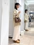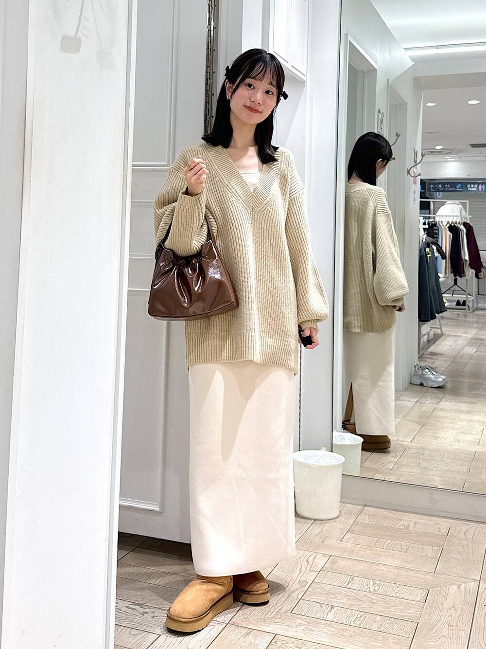 🏷️ベージュコーデ ニットは膨らみと暖かみのある糸を使用しているので畦が引き立って冬にぴったりな素材です! ざっくりとしたボリューム感でデザイン性と保温性を兼ね備えています! V開きのデザインと縦に落ちるシルエットが着膨れ見えしづらくおすすめです! スカートは身体のラインを拾いすぎず、きれいな縦のシルエットでスタイルアップが期待できるニットスカートです! ほどよいストレッチが効いているため、快適に着用いただけます✨ ウエストの内側には、細くしぼれる紐が付いているのでお好きな位置で穿いていただけます!