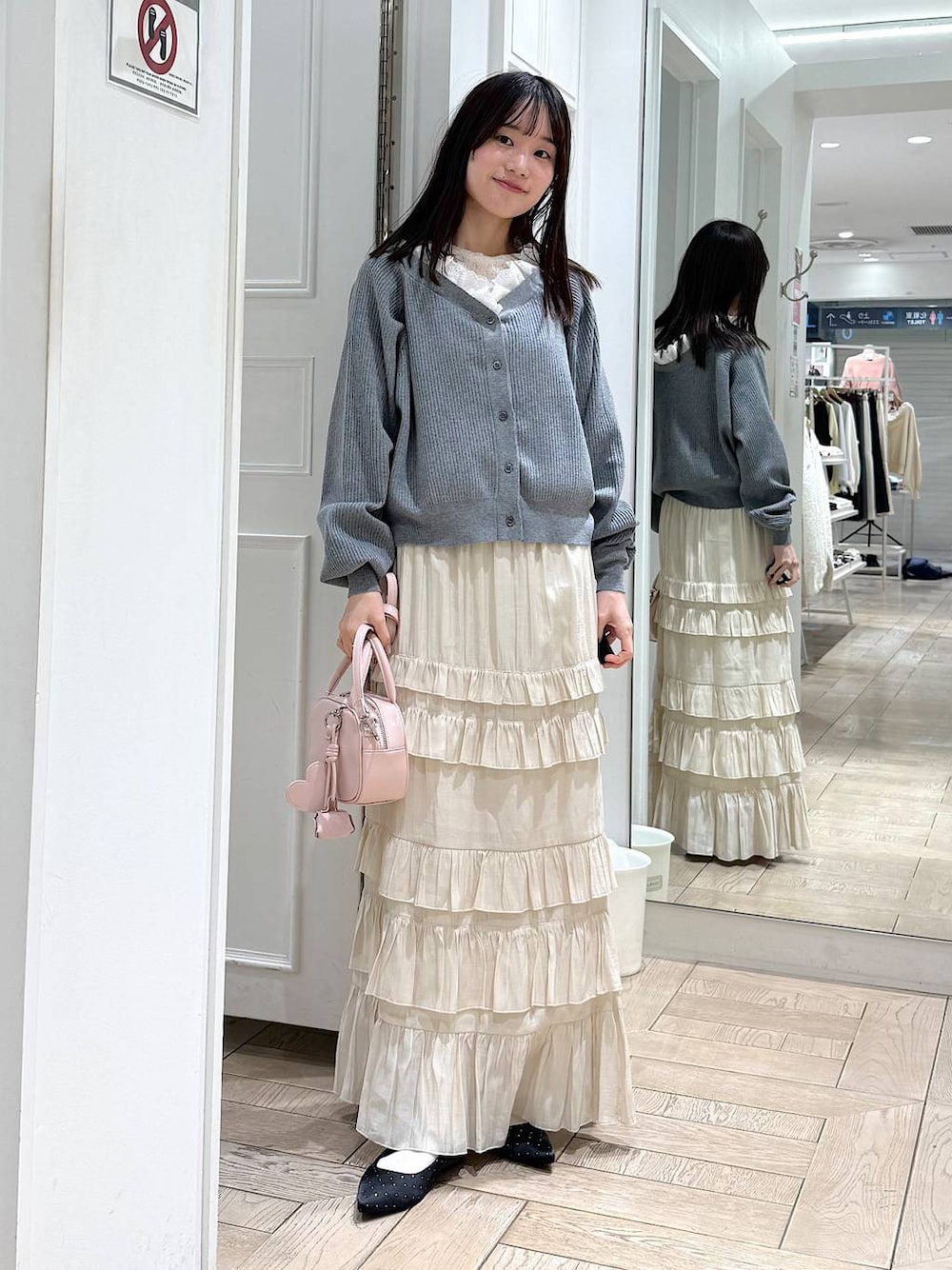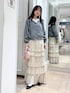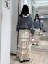 🏷️カーディガンコーデ カーディガンはトレンドのレース使いのニットカーディガンです! 衿に付けたレースパーツは取り外し可能で、前後2wayで着回し抜群です✨ スカートはティアードフリルを沢山施した贅沢なスカートです! ウエストまわりはすっきりと、ヒップからフリルが付いているのでトップスとのバランスも取りやすいです! フリルにボリュームがあるのでややAラインシルエットになっています! ウエストはオールゴム仕様で裏地付きなのもうれしいポイントです✨