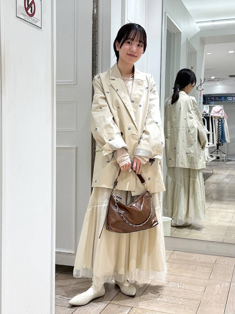🏷️ワントーンコーデ ジャケットは表地はコットンナイロン素材を使用し、程よい張り感を残しながら、柔らかい肌触りと風合いになっています! スポーティーすぎないきれいめな光沢感で、天然タッチもやや残した今年らしい素材感です! スカートはたっぷり生地を使用した贅沢なフレアシルエットです。 重ねたチュールが、光の加減でほんのり透け感とエアリーなボリュームを演出し、より軽やかでフェミニンな印象になります!