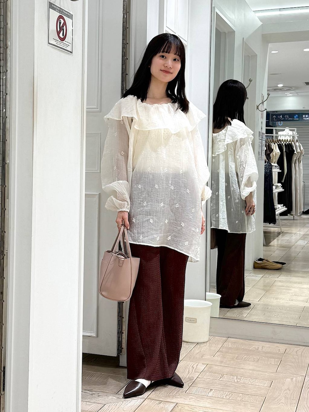 🏷️ブラウスコーデ ブラウスは程よい透け感で、おしりまで隠れる長さなので安心して着用できます🫶🏻