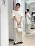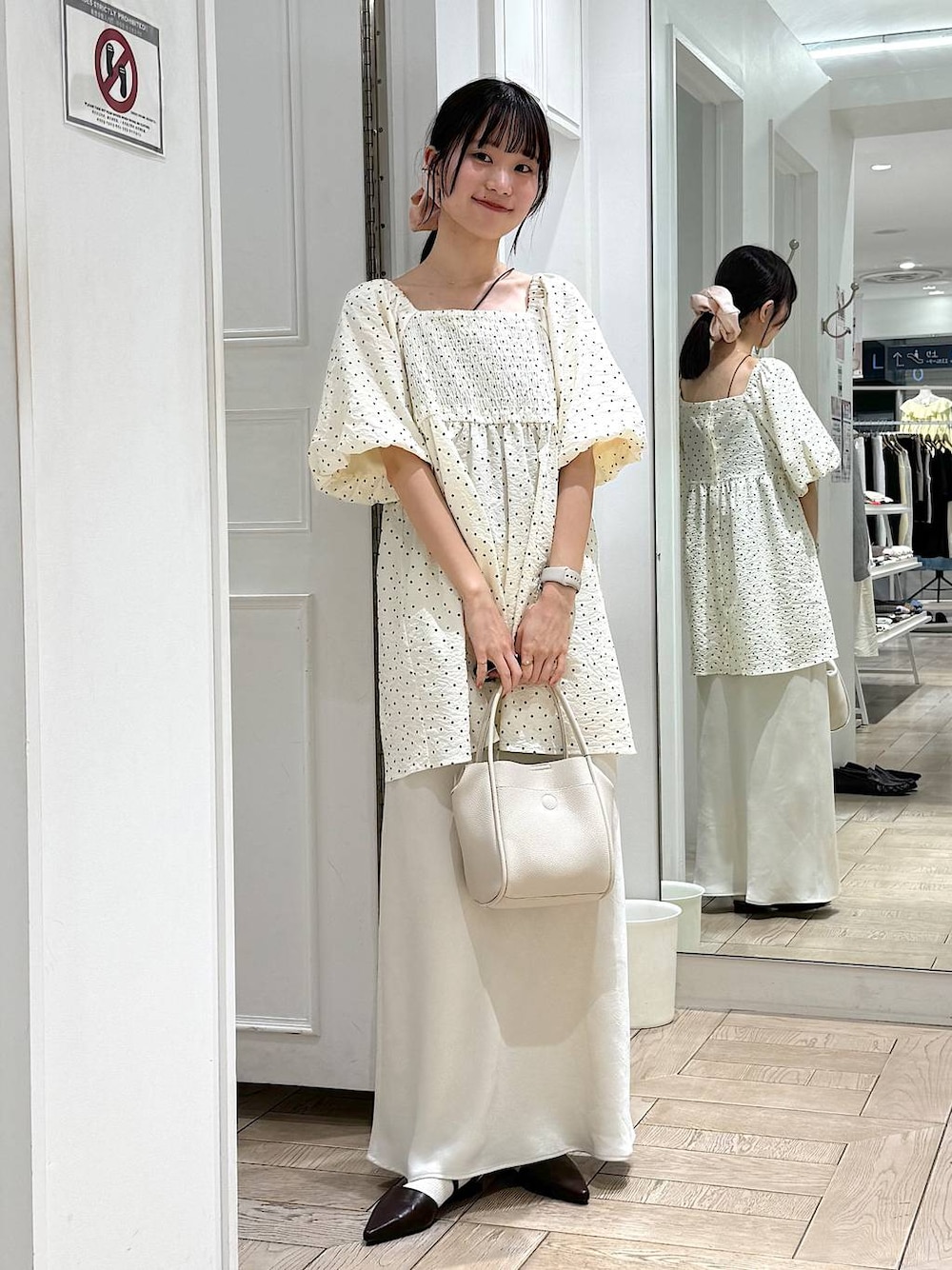 🏷️ワントーンコーデ ブラウスは適度なハリ感があって、きれいめでも着れます✨ サテンスカートと合わせてもかわいいです♡