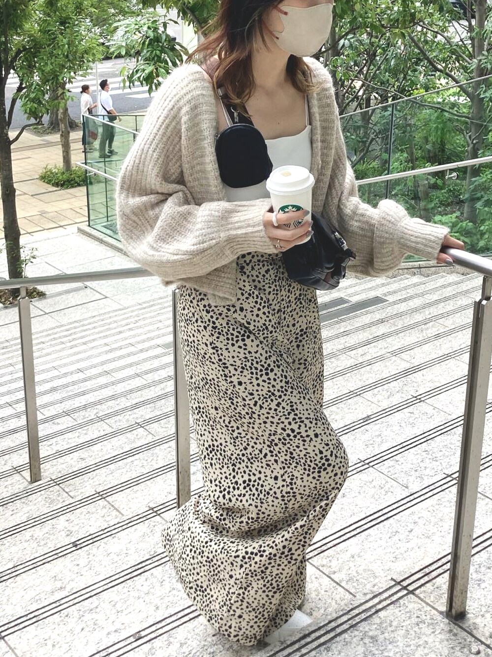【淡色ニットカーディガン】 人気すぎて再々予約のアイテム わたしは何色かミックスになってるカラーがかわいい杢ベージュ推し 柔らかい素材感でチクチクしないのと、程よいショート丈なのでロングボトムとのバランスがきれい! ワンピースに羽織ってもかわいいです 【カップ付きインナー】 細かいリブの生地ですが締め付け感がなくピタッとし過ぎないので着心地がいい アジャスターも付いてるのでフィット感も問題ないです 【ワイドパンツ】 ダルメシアン柄が可愛いワイドパンツ わたしは158cmでSサイズ着用 テロっと落ち感のある素材感なので広がり過ぎずすっきり履けます 【厚底スニーカー】 普段24.5〜25cm でLL着用 靴によってはLも履けるんですが、このスニーカーは少し幅が狭かったのでLLがちょうどよかったです ワイドパンツやデニム、ロングスカートのときに合わせると厚底で盛れるのでスタイルアップ! もちろんミニボトムとの合わせもかわいいので、なんでも合わせやすくて履きやすいですよ