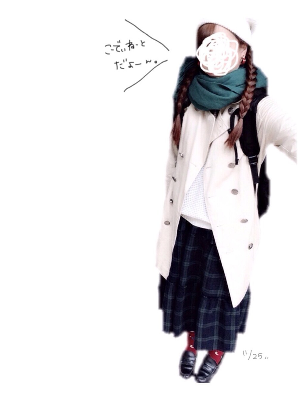 スカートとマフラーをグリーン。 ピアスと靴下をレッド。 トップスとニット帽をホワイト。 という感じで統一感を出してみました。