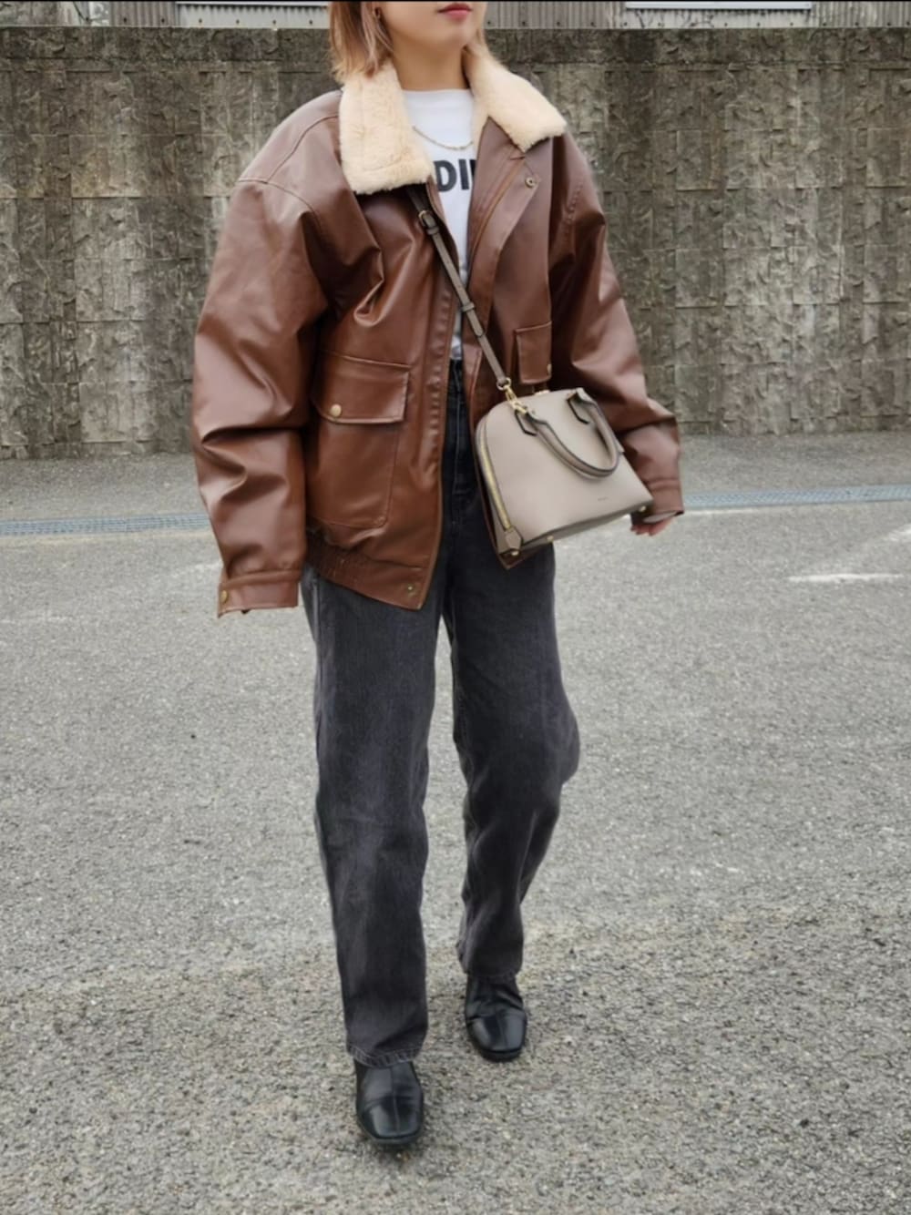 rimaのブルゾン「ヴィンテージライク合成皮革ブルゾンジャケット」を使ったコーディネート