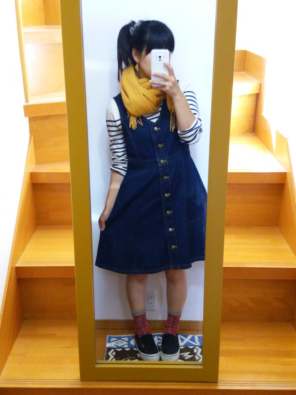 買ったばっかりのGUのワンピースは、色も形も一目惚れ( ☆∀☆) 腰の高い位置でしぼったデザインになってるから、チビスケだけど脚長効果になってるかしら(^_^;
