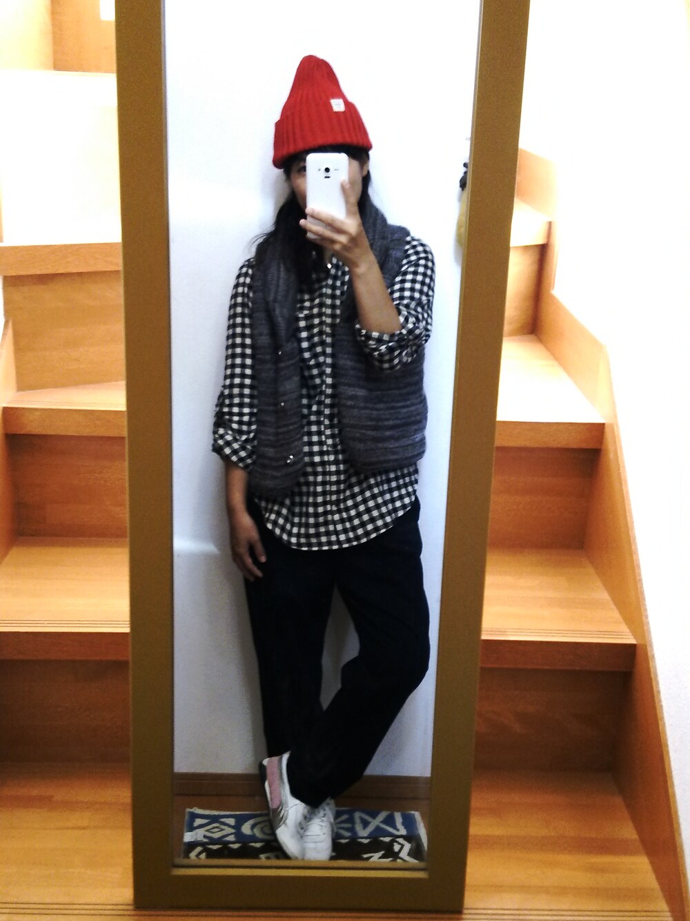 ニット帽の赤がポイント(*^^*) 買ったばかりのstudioCLIPのパンツもダボっと感が楽チンでかなりお気に入り♪