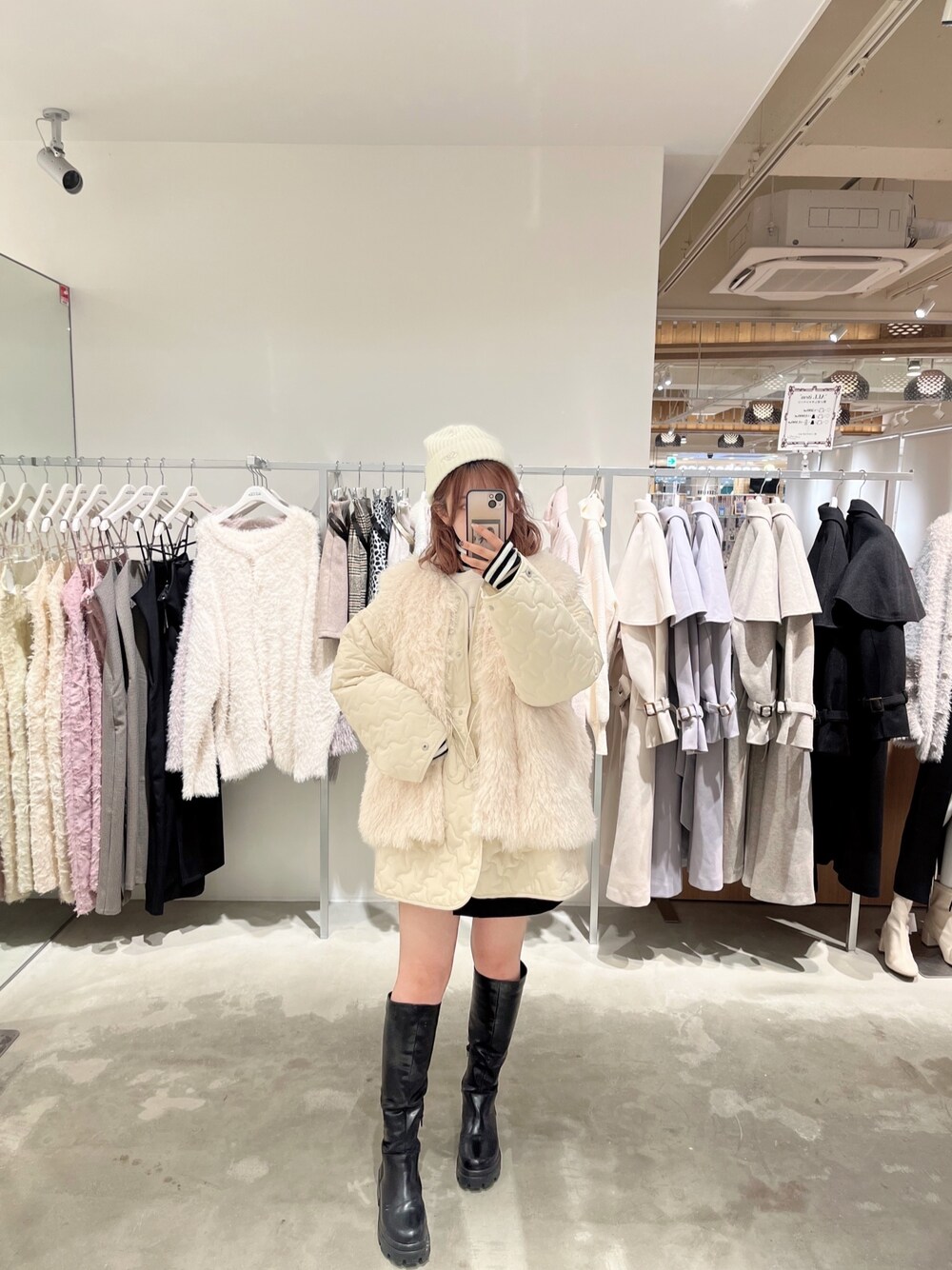 りぃ(one after another NICE CLAUP)のノーカラーコート「【マルチウェイに着回せる】キルティングコート+ファーベストセット」を使ったコーディネート
