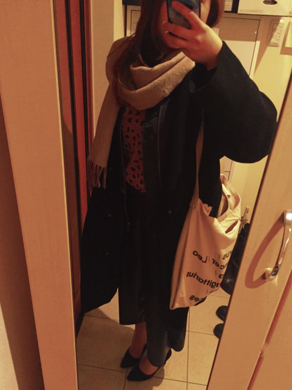 レオパード柄インナー : One tea spoon 紺のMA-1 : Stussy women 黒のチェスターコート : EMODA 黒のレザーガウチョパンツ : ナルシス 黒のハイヒール : RANDA ベージュと茶のリバーシブルマフラー : PLST(お母さんの) アメアパ風鞄は: 雑貨屋