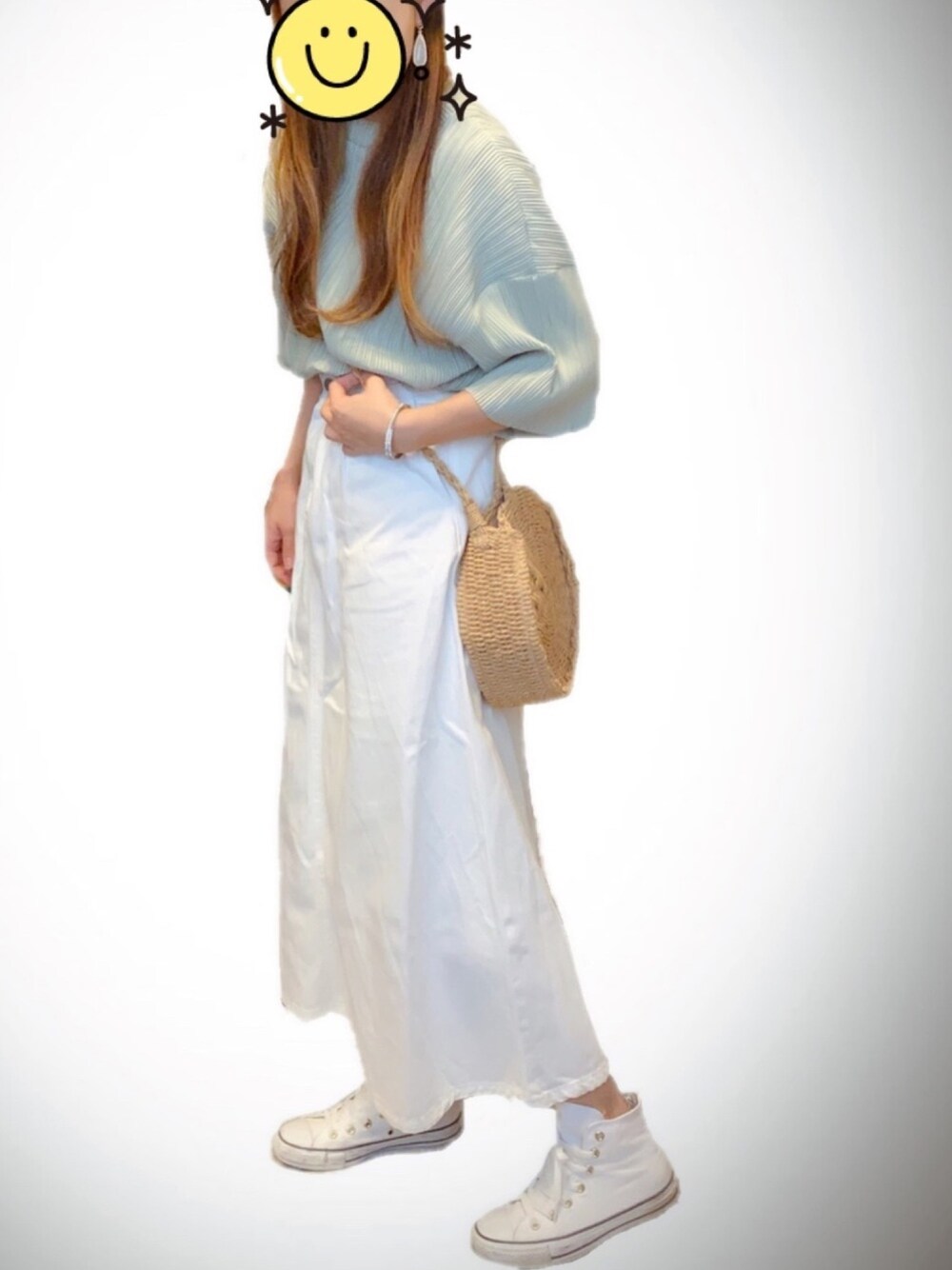 green✖️white 久々の晴れ☀️ トップスがシャイニープリーツで、 さりげなくキラキラして可愛い♡ pastel greenとwhiteで、 さわやかに♡♡