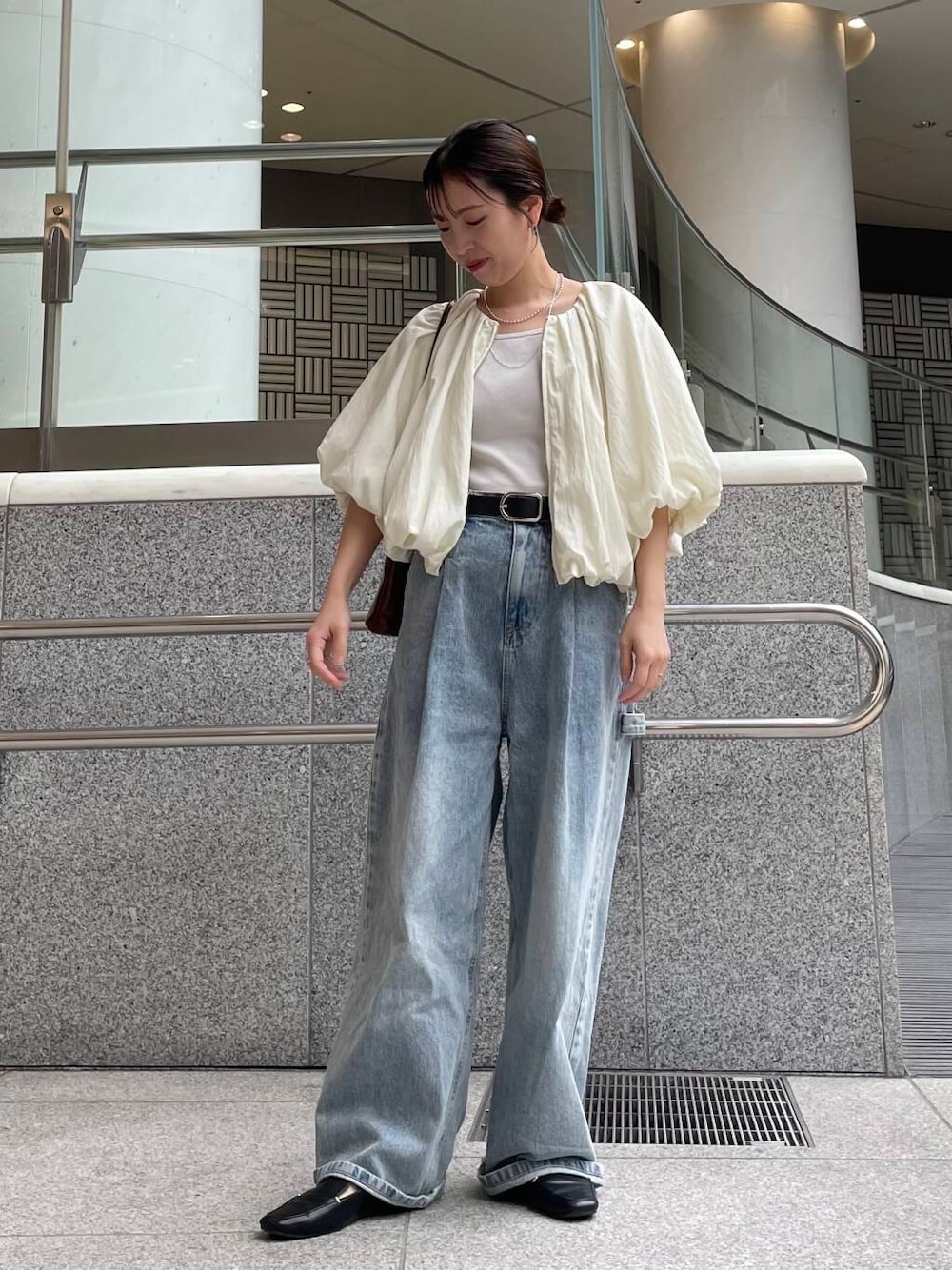 バルーンシルエットがかわいいジャケットです! さらっと着れるも裏地がしっかりしているので高見えする一枚です! デニムと合わせて大人かわいいスタイルにしました◎
