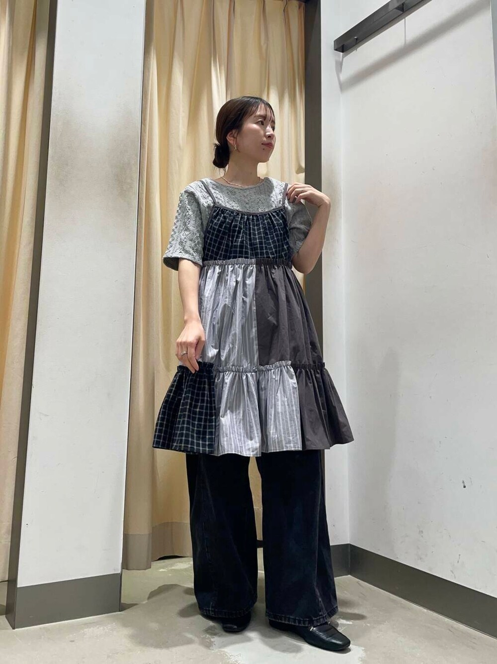 サリー(KBF 金沢百番街Rinto)のワンピース「パッチワークミニキャミワンピース」を使ったコーディネート