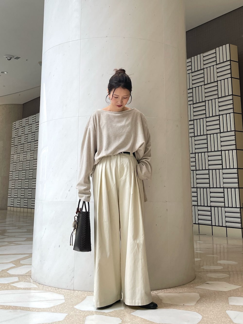 リアルバイのカットソーとタックデザインがポイントのワイドパンツでワントーンコーデにしました。 カットソーはくたっと柔らかい素材なので着心地がとても楽ちんです◎ オーバーなサイズ感ですが、襟元がボートネックなので抜け感もつくれるのも着やすいでず! リラックス感がありながら女性らしく着れるコーデが好きな方はおすすめです!