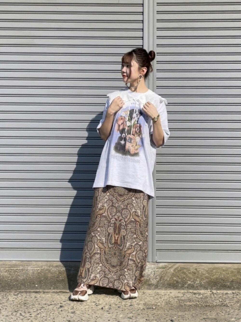 Instagram➡︎@reikaa003 柄スカートにゆるTで 古着っぽく◎