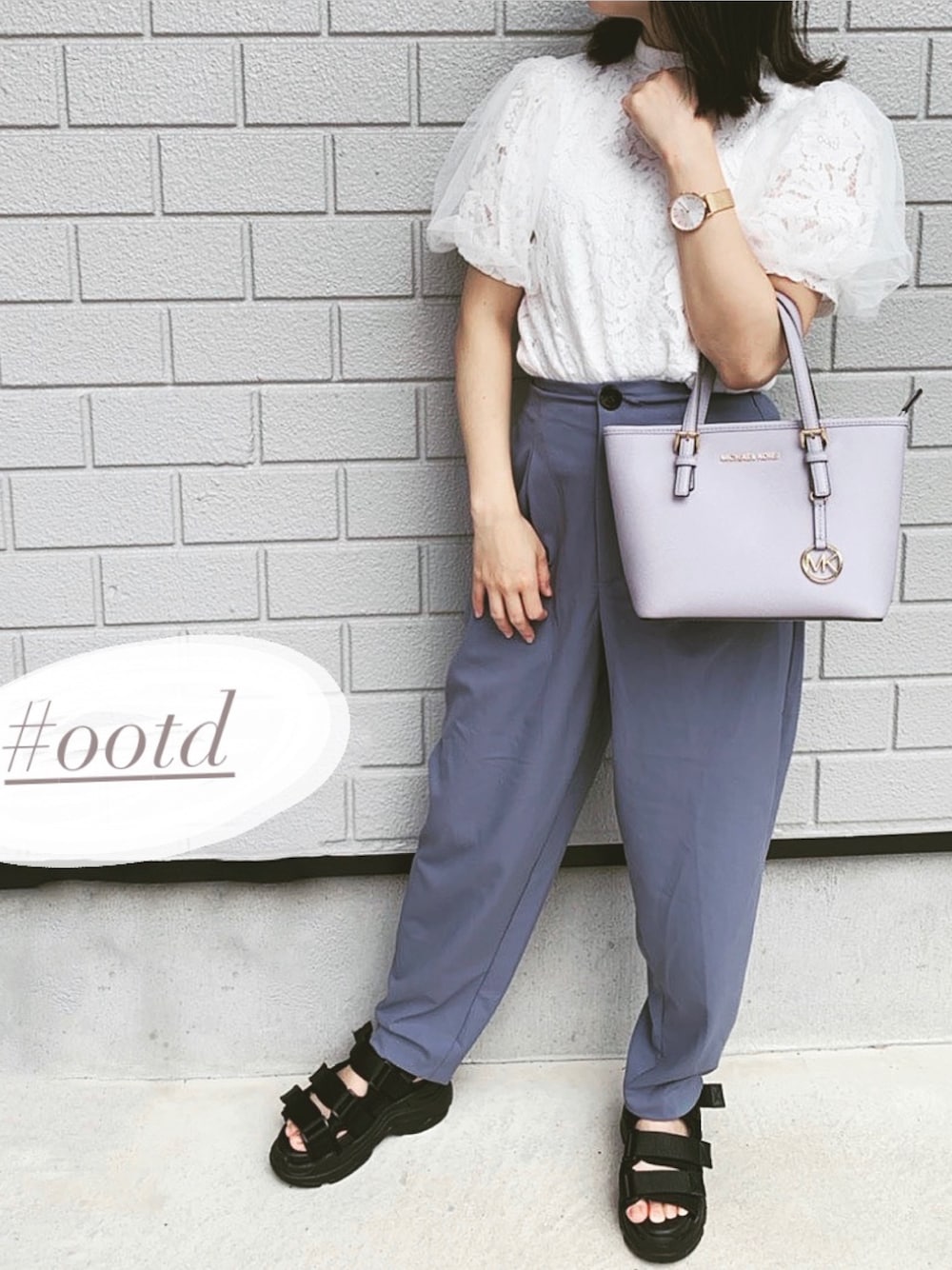 大人っぽコーデ🌙パンツの色とバッグの色合いがいい感じ◎ 足元は厚底のサンダルを履いてカジュアルさもプラスしました🙌🏻 トップスの袖が膨らんでて可愛い👼🏻