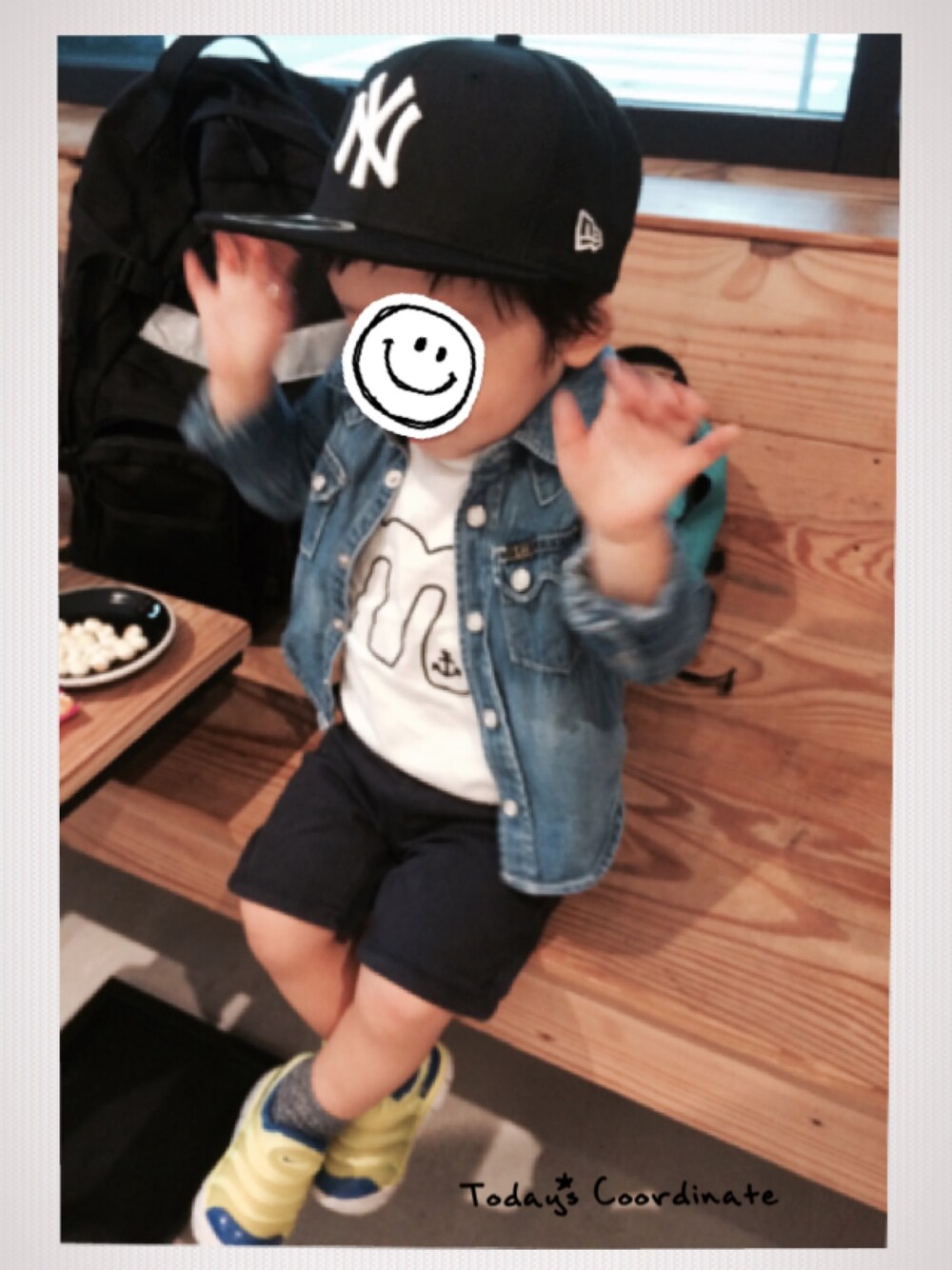 息子コーデ(o^^o)☆ お菓子食べてご機嫌ポーズ! この時期、昼間は暑かったりするので脱ぎ着しやすいコーデに☆